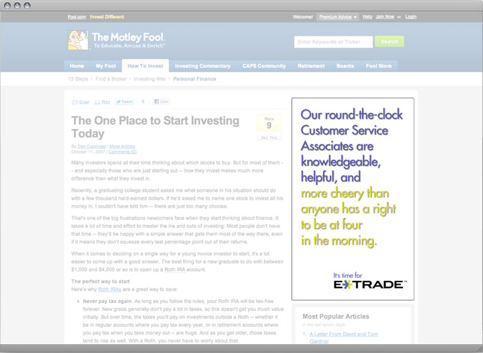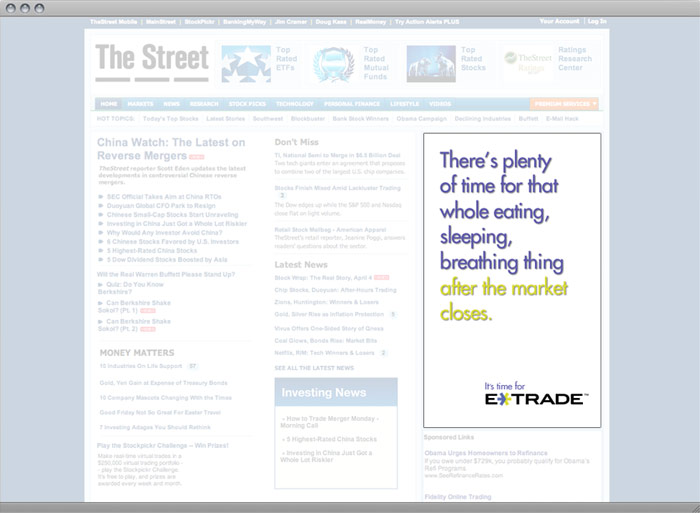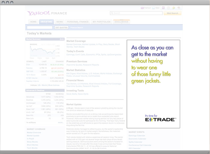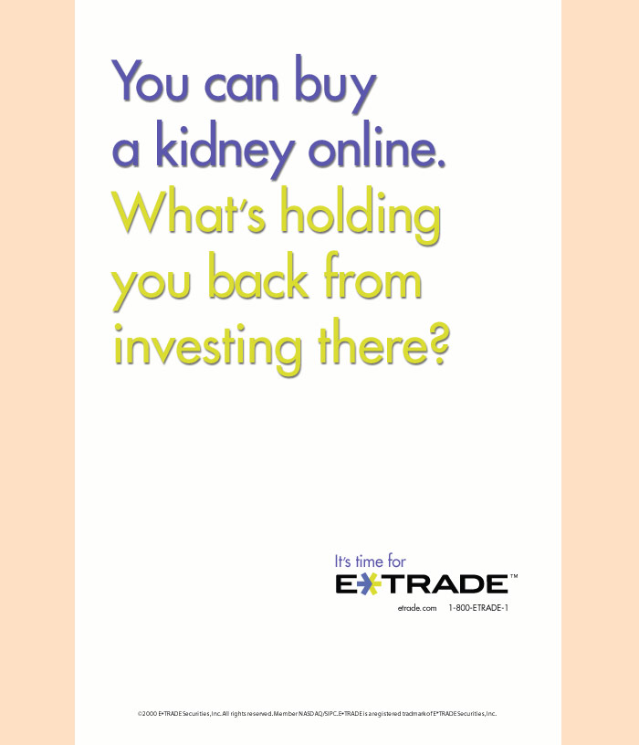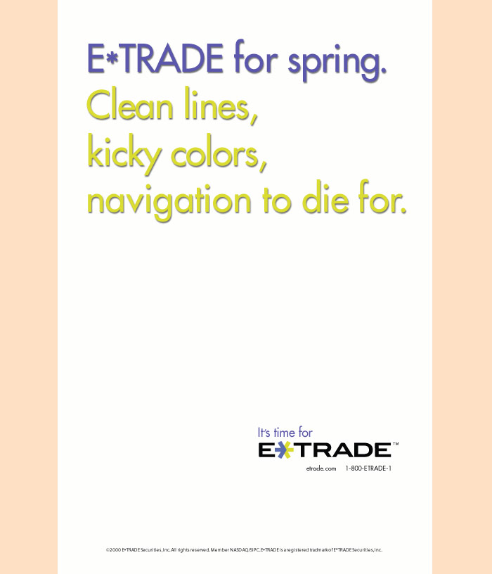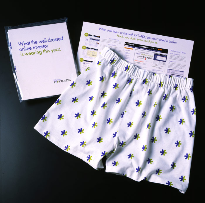 To coax the would-be, do-it-yourself investor into the —then nascent— waters of investing online, this campaign took a “dude, you can do it” attitude that ultimately helped establish ETRADE as the premiere online investing site in America. This idea of confident self-reliance is cemented by the smart, flip attitude which permeates all aspects of the work, from print ads to digital media to over one hundred pieces of award-winning collateral—including over 5,000 pairs of boxer shorts which were mailed out to half-naked investors all across the country.