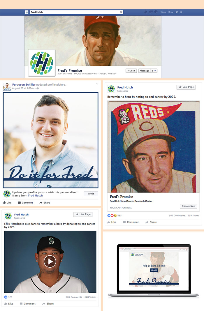 SOCIAL MEDIA: “Hero to Hero” - Seattle athletes from the Seahawks, Sonics, Mariners, Sounders, share videos on Facebook and Tweets supporting “Fred’s Promise”, asking fans to donate. “Do It For Fred” Facebook/Twitter/Instagram users can adorn their profile pictures with this rallying cry as a show of solidarity with the community in making good on Fred’s promise and curing cancer in the next decade. An online campaign donation page --carrying over the look and feel of the campaign-- provides a simple entry point into the Fred Hutch site closing the loop on the user experience.