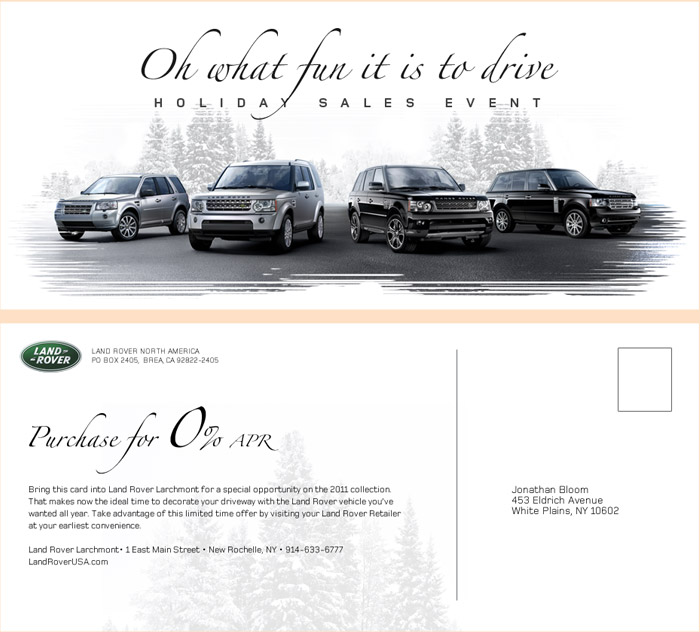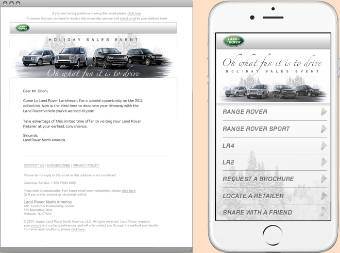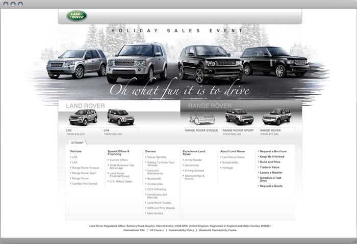 As the calendar flips to its last page and visions of unsold overstock dance in retailers’ heads, the annual holiday sales event comes down the chimney (with a bound). With this simple re-skin, all of Land Rover’s pre-existing interactive sales tools were put to immediate use in pushing holiday sales during the all-important final quarter. Supported by personalized e-mails and print-on-demand DM pieces, this elegant and economical re-skin had would-be Land Rover owners dreaming of a (black and) white Christmas.