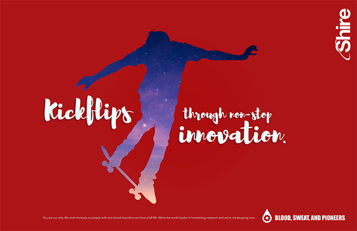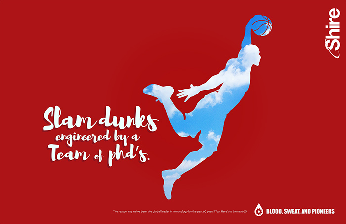 For this HCP-targeted campaign, Shire requested a visually bold statement trumpeting their sixty years of pioneering innovation in the world of Hematology research and treatment. Quite literally crafting breakthrough after breakthrough for a “sky’s the limit” optimism for the future of those suffering from rare blood disease.
