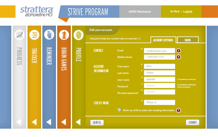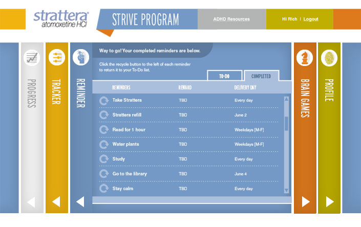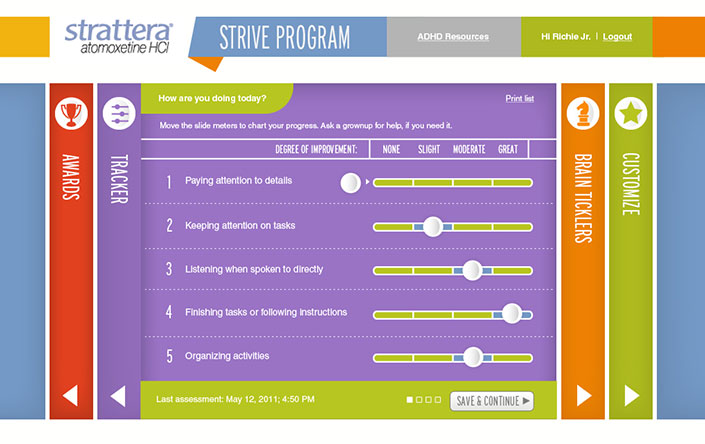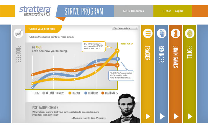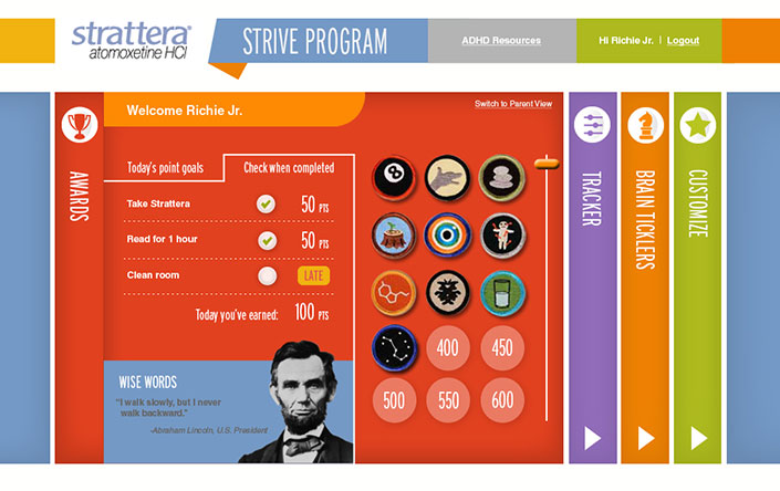 To further enhance their ADHD treatment program, Strattera asked us to create an application to aid ADHD sufferers in their daily lives. Deeply scalable and customizable, this app allows the user to track their improvements on day-to-day tasks; set up email/text message reminders; play games that improve their concentration skills; chart their progress throughout the course of their treatment; and even print out report cards to share with their physician. A children’s version of the app features an additional interface that allows a parent or caregiver to input tasks which are automatically applied to an internal rewards system. The child then accrues points for tasks completed to be redeemed for rewards of the parents’ choosing. Mix in a series of pop-up inspirational quotes and customizable tips and you’ve got a powerful, intuitive tool for making life a bit less complicated.